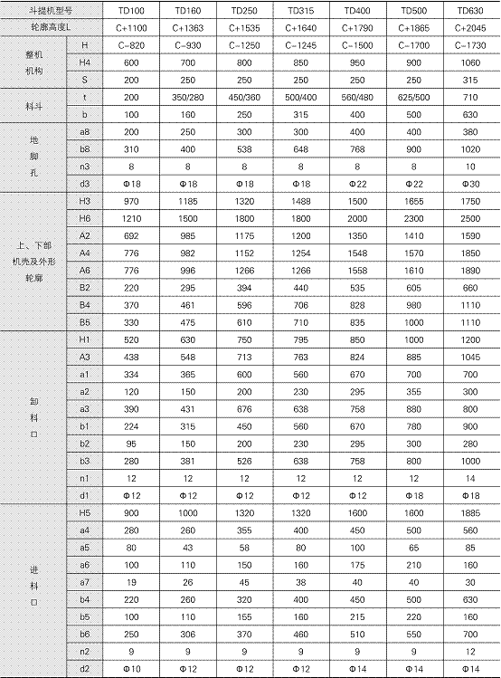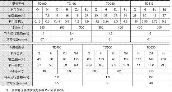 TD型斗提機備有四種料斗型式:Q型(淺斗)、H型(弧底斗)、Zd型(中深斗)、Sd型(深斗)。