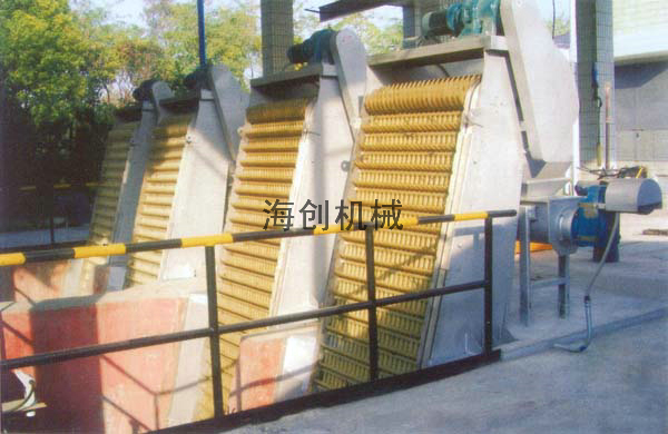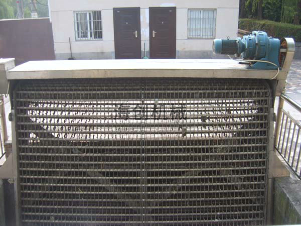 該設(shè)備采用回轉(zhuǎn)式,由一種特殊形狀的犁形耙齒按一定的裝配順序和數(shù)量排列在橫軸上,組成耙齒 鏈,根據(jù)過(guò)水流量,裝配成不同的間隙,安裝在泵站或水處理系統(tǒng)的入口處,當(dāng)驅(qū)動(dòng)裝置帶動(dòng)耙齒鏈自下向上運(yùn)動(dòng)時(shí),水中的雜物被耙齒鏈撈起,液體則在柵隙中流過(guò),設(shè)備轉(zhuǎn)動(dòng)到上部頂點(diǎn)后,耙齒鏈改變運(yùn)行方向,由上向下運(yùn)動(dòng),物料依靠自重從耙齒上自行脫落,當(dāng)耙齒從反面轉(zhuǎn)到設(shè)備底部時(shí),又開始另一循環(huán)往復(fù)的連續(xù)運(yùn)行,從而不斷的從水中清撈雜物,達(dá)到固液分離的目的。