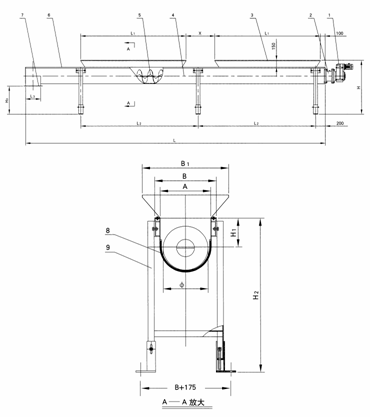 5、螺旋葉片9、支架(高度可調(diào))8、耐磨襯墊7、出料口6、蓋板4、U型殼體3、進(jìn)料口2、軸承座1、驅(qū)動裝置