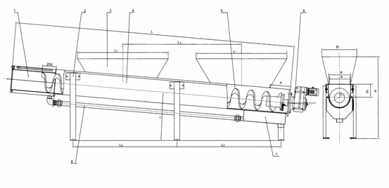 該設(shè)備采用無軸螺旋式,當(dāng)物料從輸送壓榨機的進(jìn)料斗進(jìn)入,依靠螺旋葉片的旋轉(zhuǎn)將物料推移滑行,沿U型輸送槽送至壓實區(qū),在壓榨管及出料門蓋的反彈簧壓力下,使柵渣壓榨脫水,脫水后的柵渣強制打開壓力板落至垃圾小車內(nèi)外運,擠壓的滲水則通過回水管路流入格柵井中。